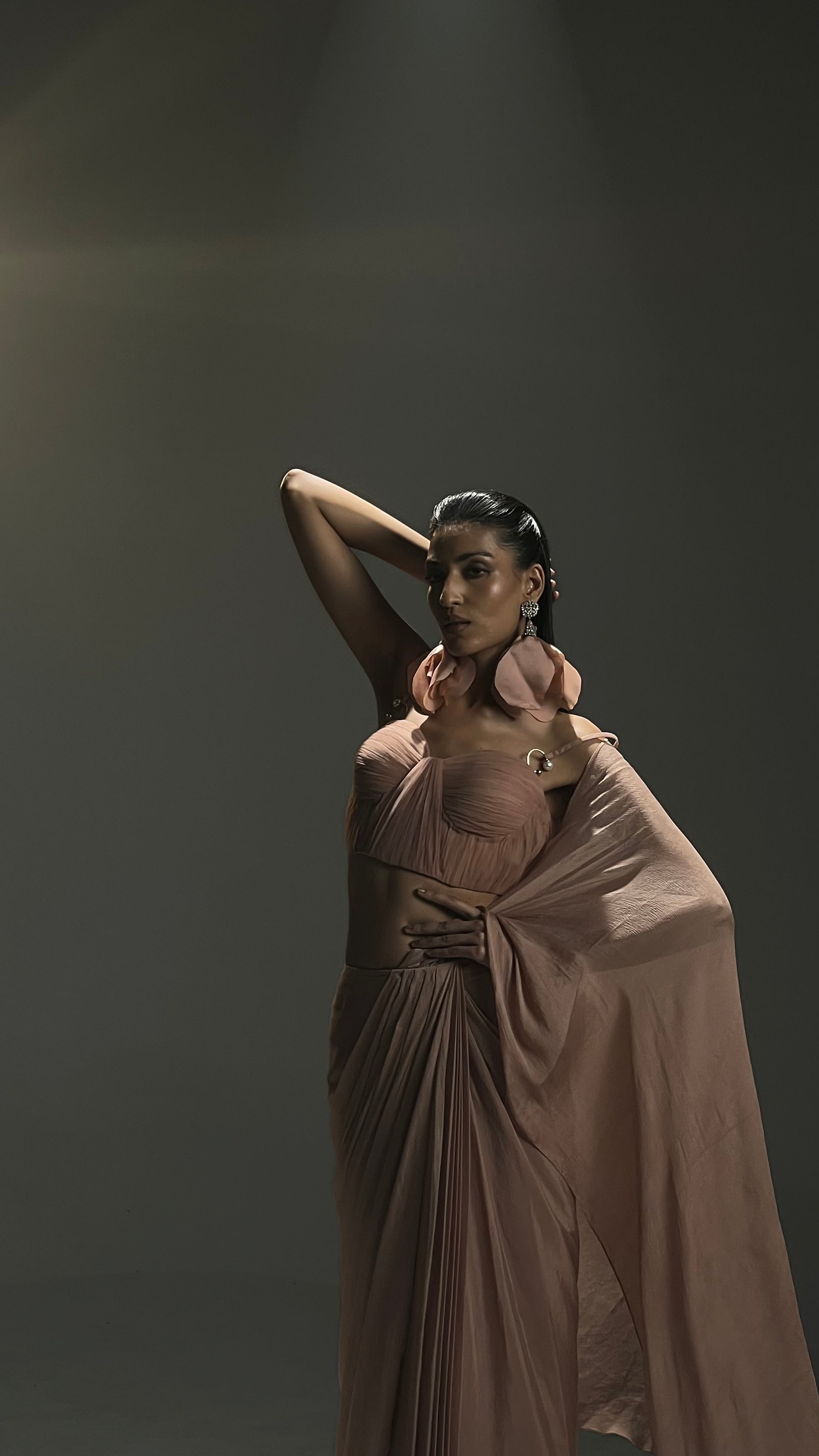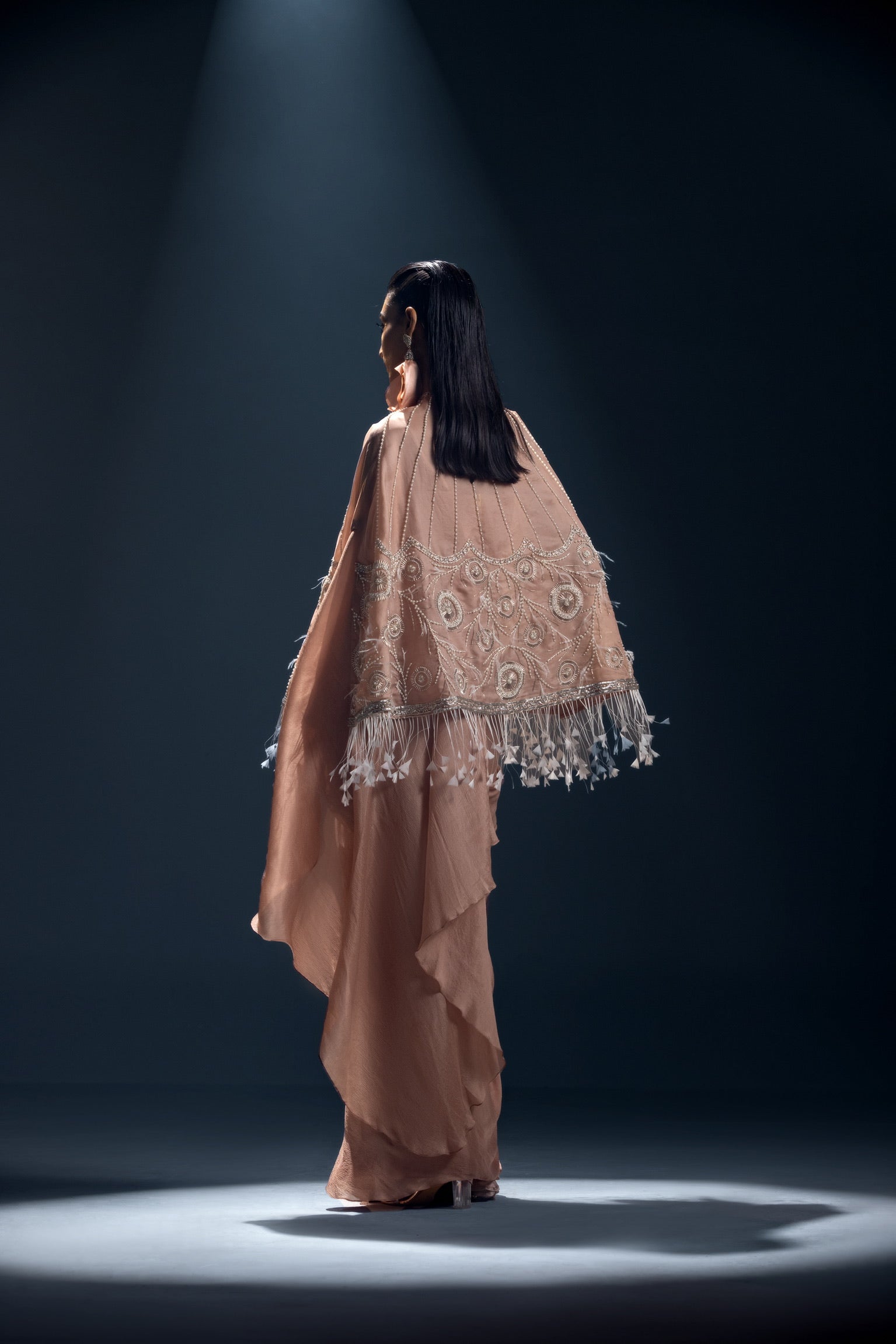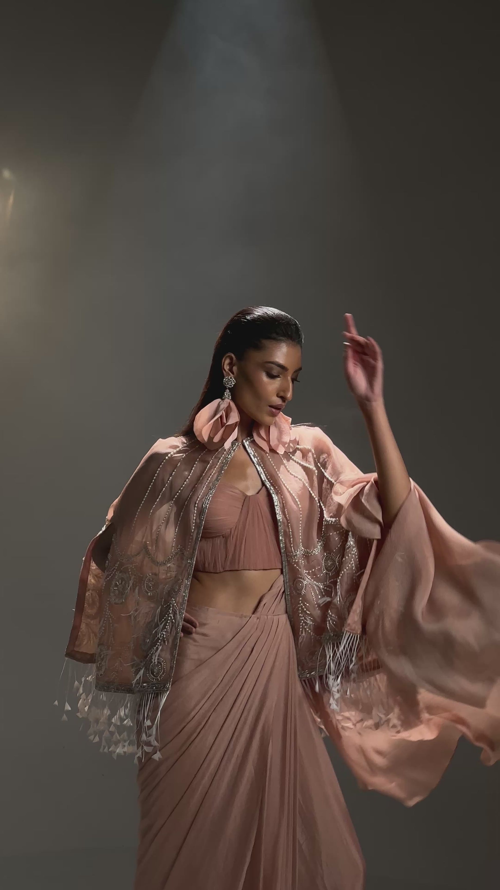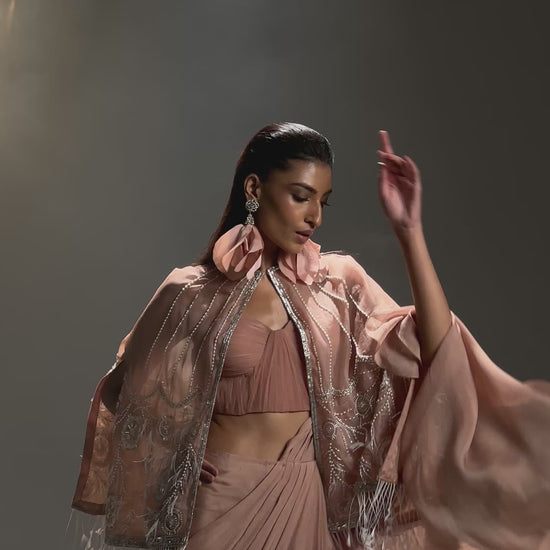 English rose pink silk organza hand embroidered cape with a pre drapped Saree set along side ruffle corset blouse.