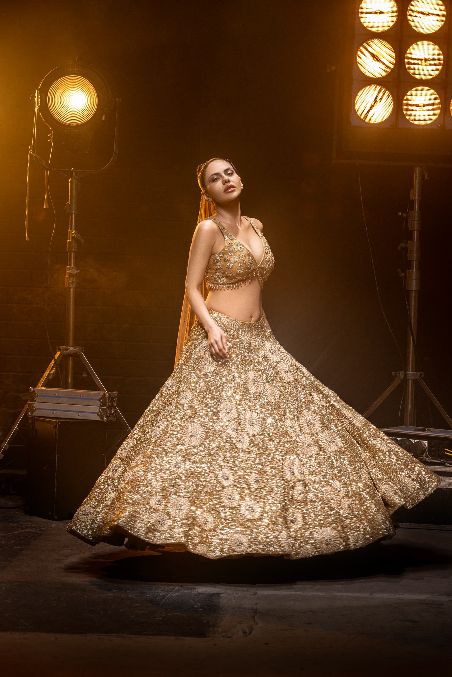 This exquisite golden lehenga features intricate hand-embellished sequins that shimmer with every movement. The elegant design is enhanced with detailed threadwork, adding a touch of sophistication. Paired with a luxurious double dupatta, this ensemble is perfect for making a grand entrance at any special occasion.